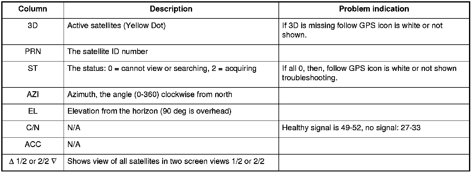 - The table of values shown below define the terns at the top the columns in the GPS Detail screen.