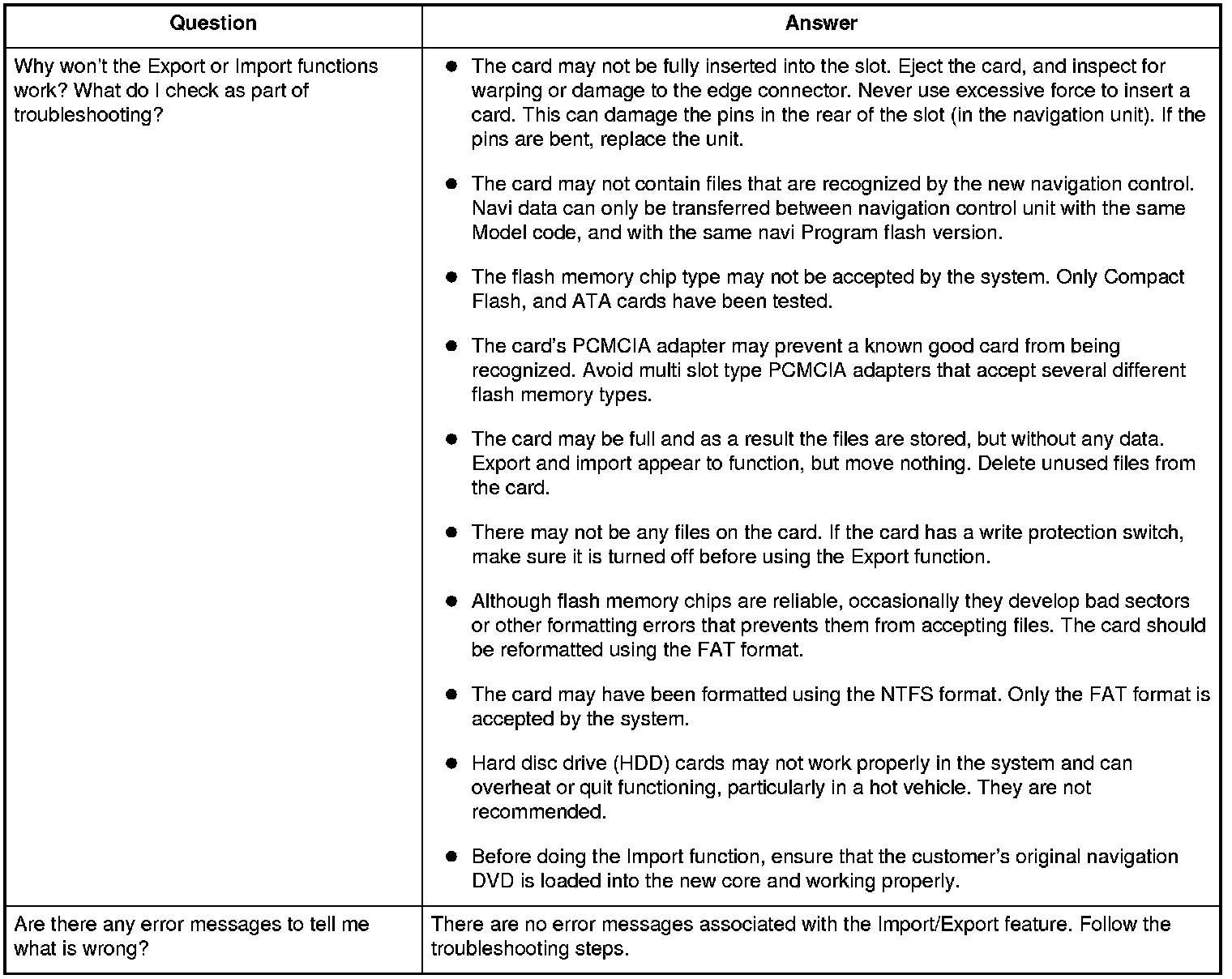 This is similar to saving and entering the customer's audio presets when replacing an audio core. The transferred information includes their Setup settings, and personal addresses. The dealer inserts a PC card (like the PC card in the HDS), and then selects the Save Users Memory function. The two functions in this diagnostic screen are Export and Import. Export saves the customer's data to the PC card, and Import moves the PC card files to the new navigation core.