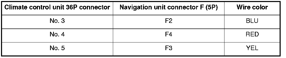 NO - Repair open in the wire(s) between climate control unit 36P connector and navigation unit connector F (5P).