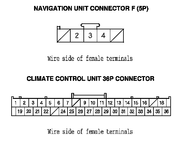 4. Check for continuity between climate control unit 36P connector and navigation unit connector F (5P) according to the table.