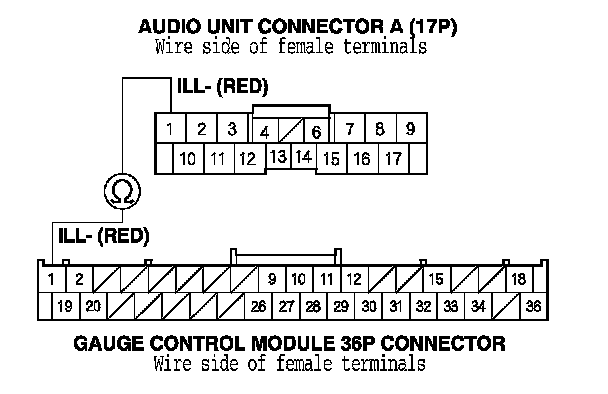 8. Check for continuity between navigation unit connector A (17P) terminal No. 1 and gauge control module 36P connector terminal No. 1.
