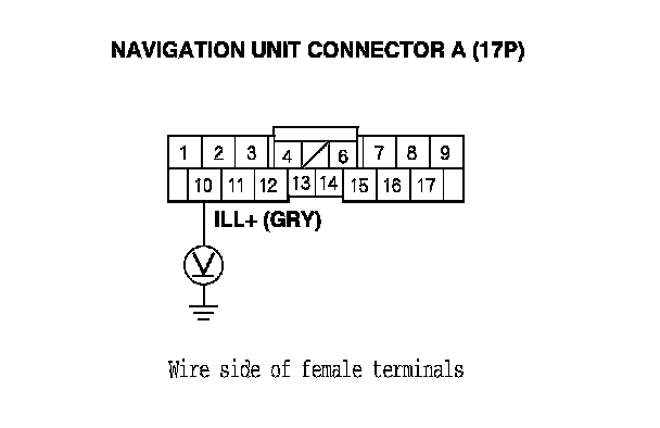10. With the headlight switch still on, measure the voltage between navigation unit connector A (17P) terminal No. 10 and body ground.