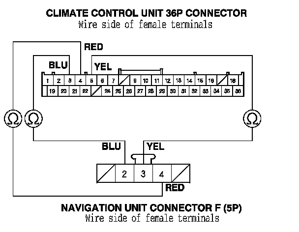 6. Check for continuity between the following terminals of the climate control unit 36P connector and navigation unit connector F (5P).
