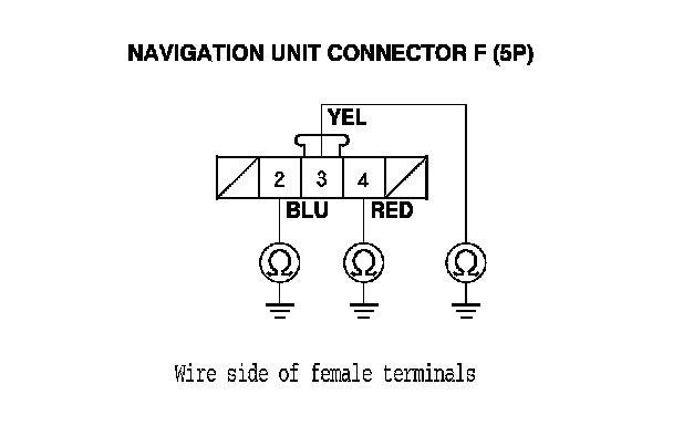 7. Check for continuity between body ground and navigation unit connector F (5P) No. 2, 3, and No. 4 terminals individually.
