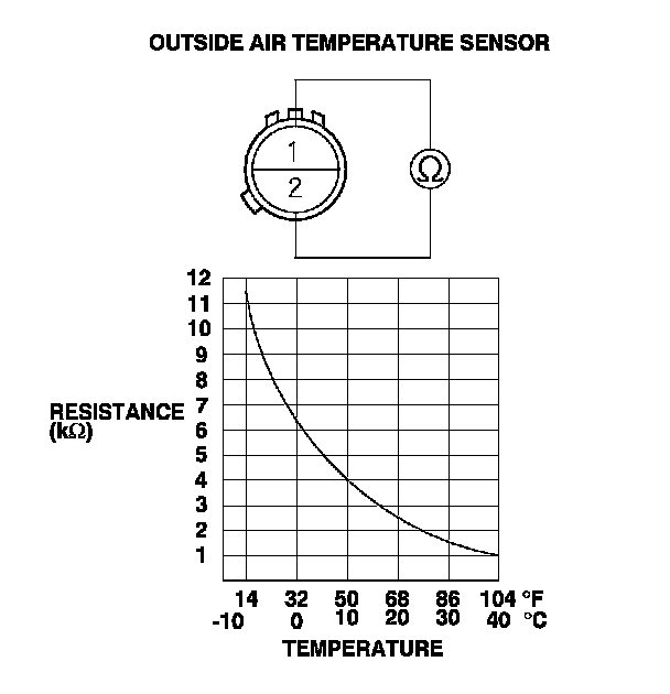 3. Compare the resistance reading between the No. 1 and No. 2 terminals of the outside air temperature sensor with the specifications shown in the graph; the resistance should be within the specifications.