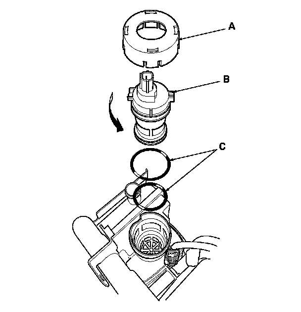 Install the parts in the reverse order of removal with new O-rings (C) and a new cap.