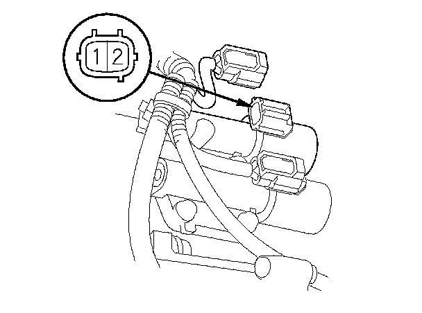 13. Connect a jumper wire from the negative battery terminal to A/T clutch pressure control solenoid valve C connector terminal No. 2, and connect another jumper wire from the positive battery terminal to the connector terminal No. 1. Make sure A/T clutch pressure control solenoid valve C moves.