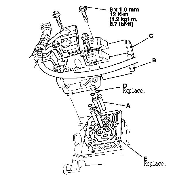 11. Remove the ATF joint pipes (A), the O-rings (D), and the gasket (E).