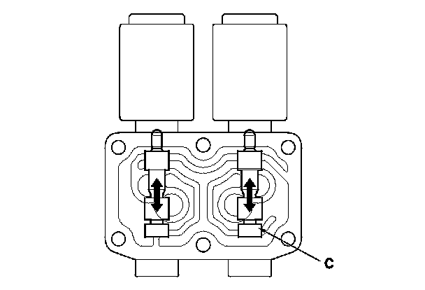 14. Disconnect one of the jumper wires and, check valve movement at the fluid passage in the valve body mounting surface. If the valve binds or moves sluggishly, or if the solenoid valve does not operate, replace A/T clutch pressure control solenoid valves B and C.