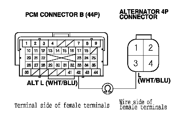 24. Check for continuity between PCM connector terminal B42 and alternator 4P connector terminal No. 3.
