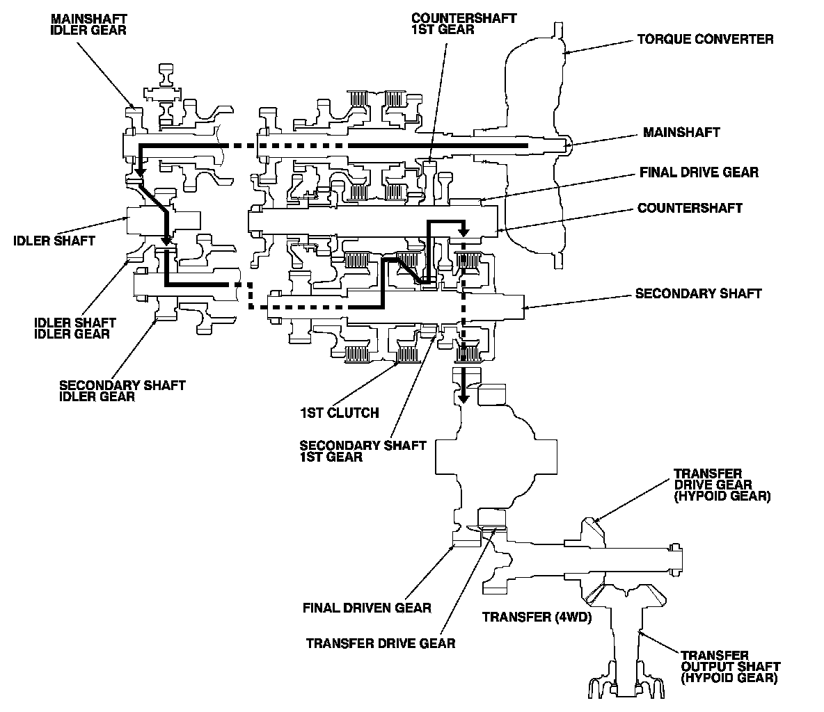 - Hydraulic pressure is applied to the 1st clutch, then the 1st clutch engages the secondary shaft 1st gear with the secondary shaft.