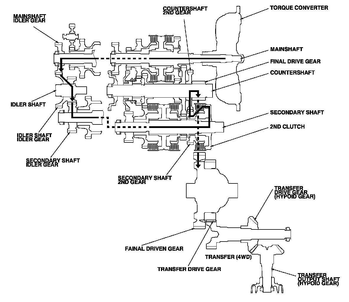 - Hydraulic pressure is applied to the 2nd clutch, then the 2nd clutch engages the secondary shaft 2nd gear with the secondary shaft.