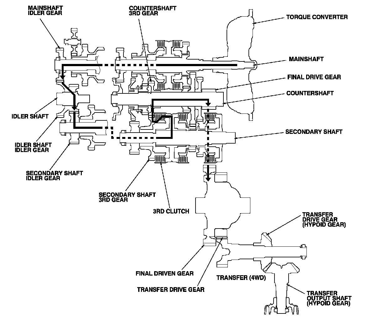 - Hydraulic pressure is applied to the 3rd clutch, then the 3rd clutch engages the secondary shaft 3rd gear with the secondary shaft.