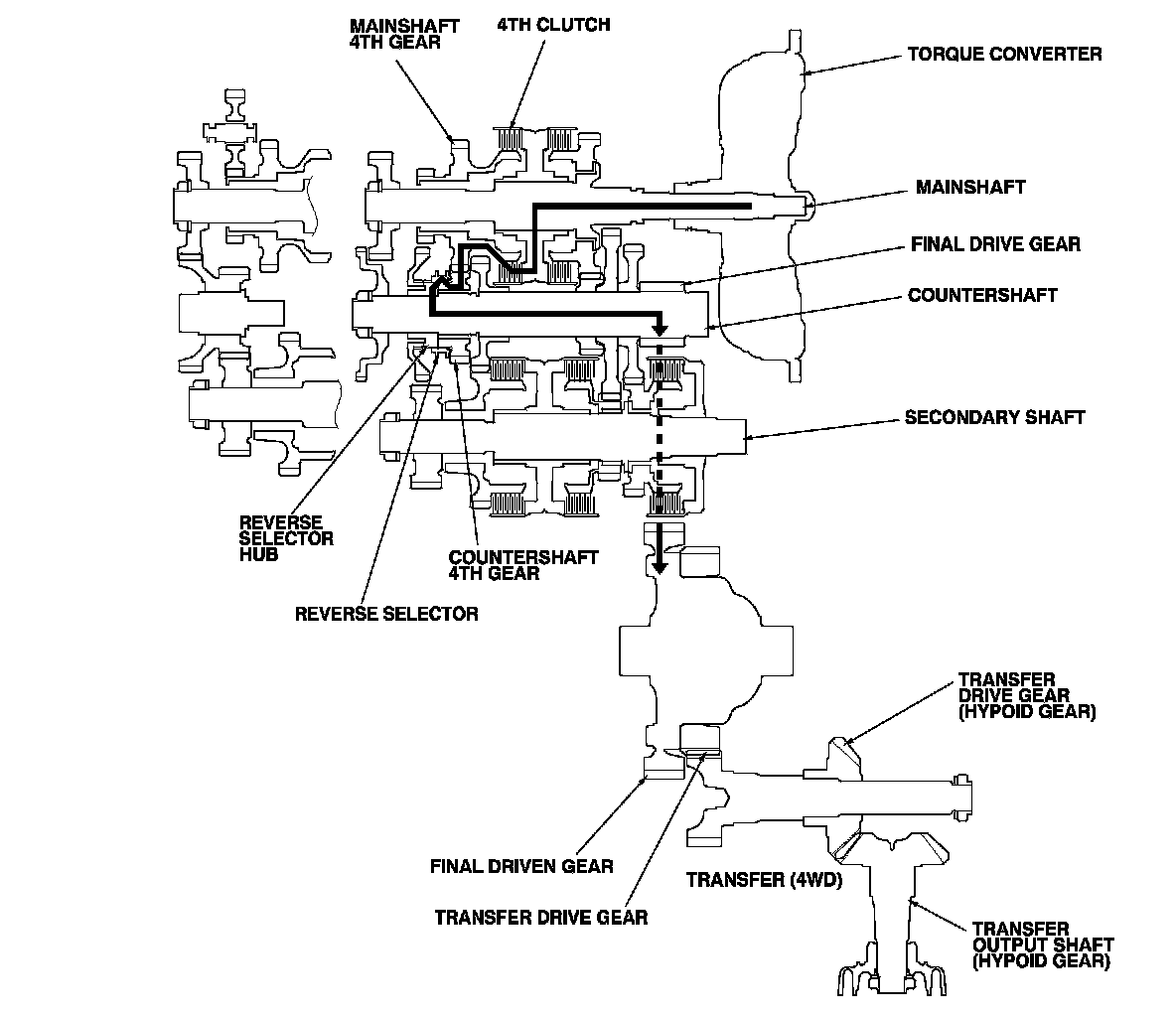 - Hydraulic pressure is also applied to the 4th clutch, then the 4th clutch engages the mainshaft 4th gear with the mainshaft.