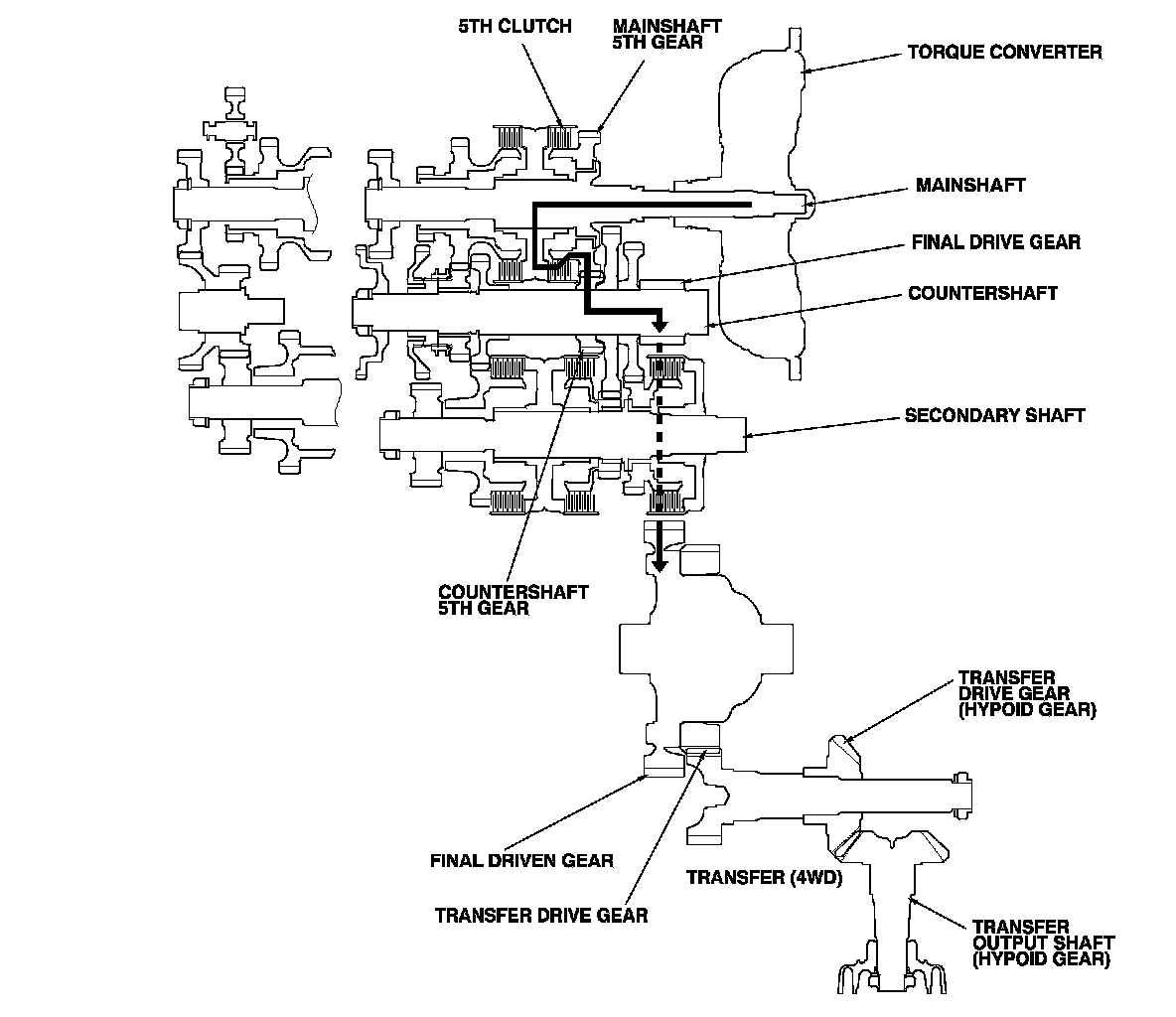- Hydraulic pressure is applied to the 5th clutch, then the 5th clutch engages the mainshaft 5th gear with the mainshaft.