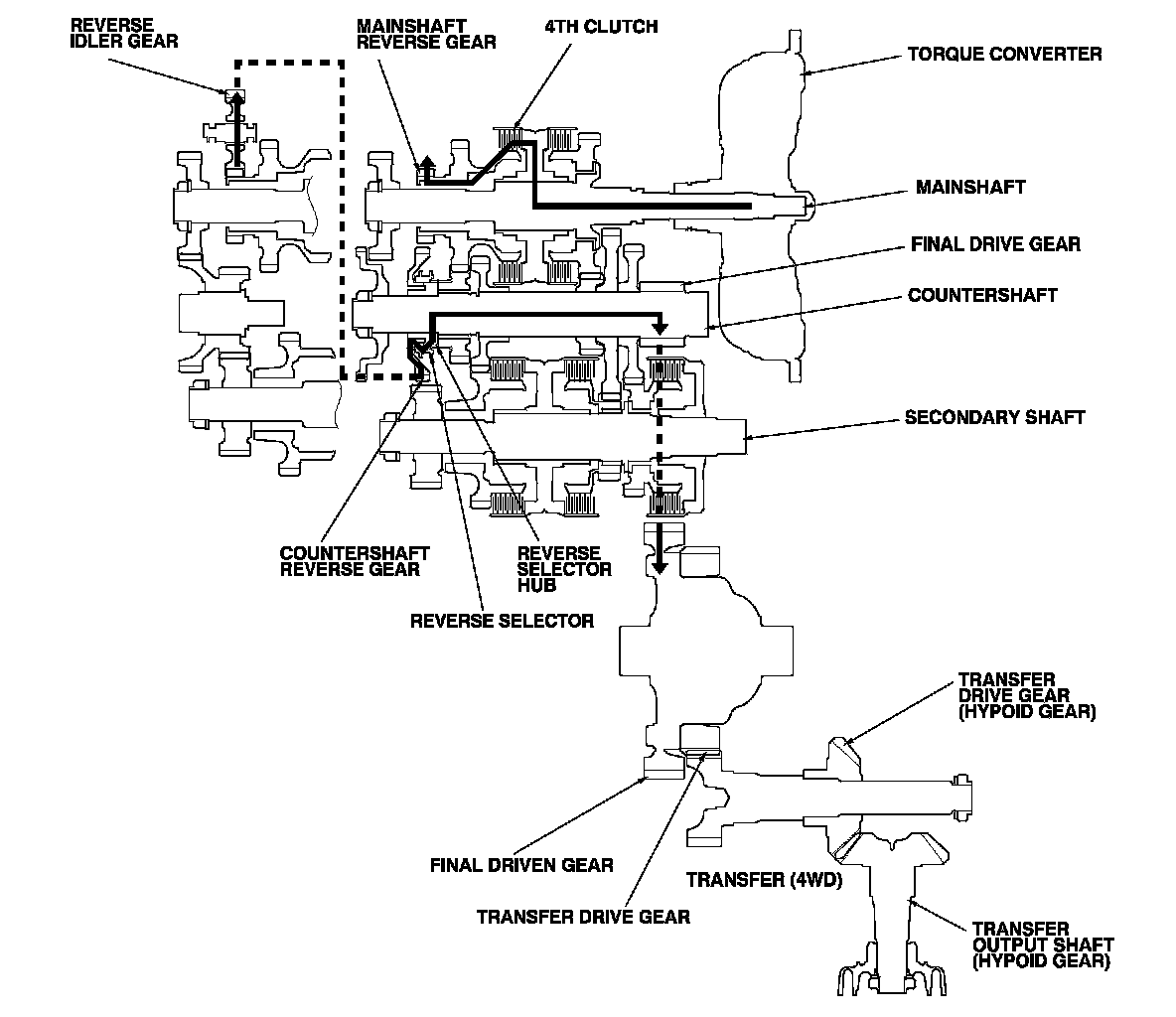 - Hydraulic pressure is also applied to the 4th clutch, then the 4th clutch engages the mainshaft reverse gear with the mainshaft.
