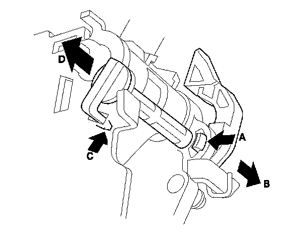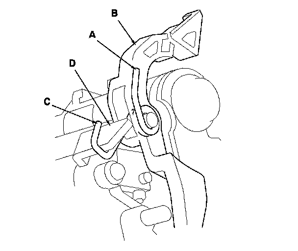 8. Make sure that the release spring end (A) is installed in the shift lock release (B), and the hooked end (C) is on the catch (D).
