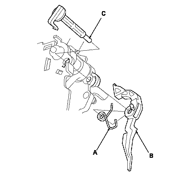 7. Install the shift lock release shaft (C) in the shift lever, and install the shift lock release and the release spring on the release shaft end.