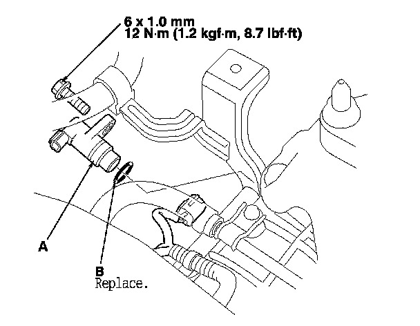 3. Install a new O-ring (B) on a new input shaft (mainshaft) speed sensor, then install the input shaft (mainshaft) speed sensor in the transmission housing.
