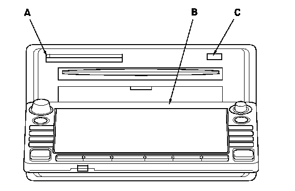 4. Push the CD eject button (C), and navigation DVD eject button and remove the discs (holding both discs by their edges to avoid fingerprints). To avoid scratches, place the navigation DVD, and customer's CD in a jewel case if available.
