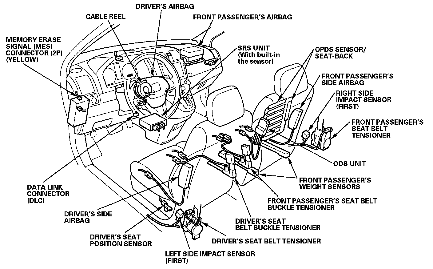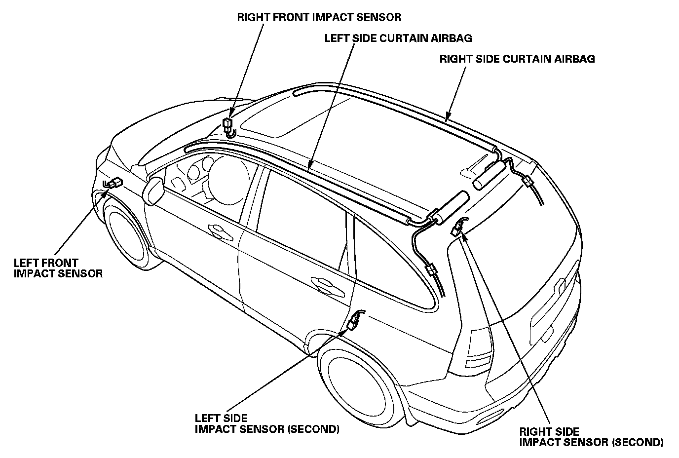 Supplemental Restraint System (SRS)This model has an SRS which includes a driver's airbag in the steering wheel hub, a passenger's airbag in the dashboard above the glove box, seat belt tensioners in the front seat belt retractors, seat belt buckle tensioners in the front seat belt buckles, side airbags in the front seat-backs, and side curtain airbags in the sides of the roof. The SRS unit is separate from the airbag assembly and has built-in sensors. The following precautions should be observed when doing sheet metal work, paint work, and repair work around the locations of the SRS components.