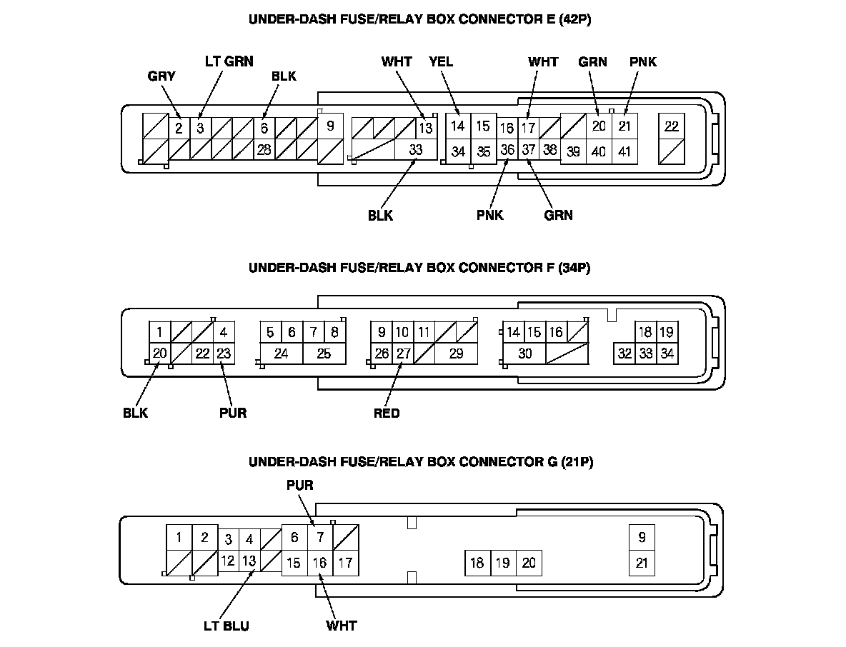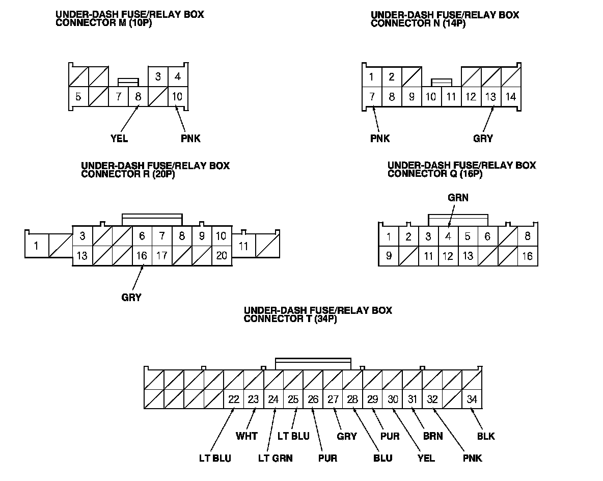 2. Disconnect under-dash fuse/relay box connectors E, F, G, M, N, Q, R, and T.