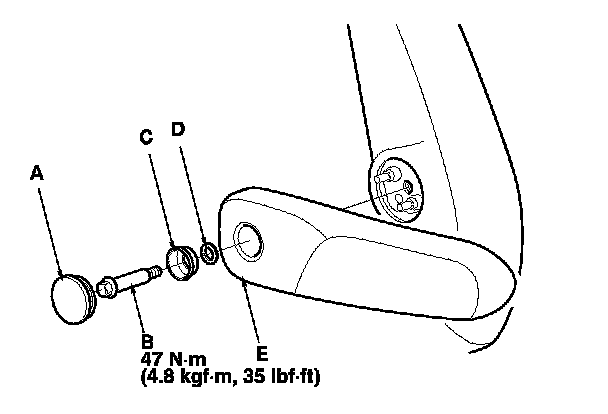 2. Remove the center pin (B), the bushing (C), and the washer (D), then remove the armrest (E).
