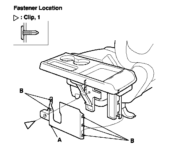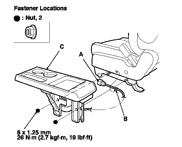 3. For some models: Disconnect the center table cord connector (A), and release the harness clip (B) from the passenger's seat. Remove the nuts, then remove the center table (C).