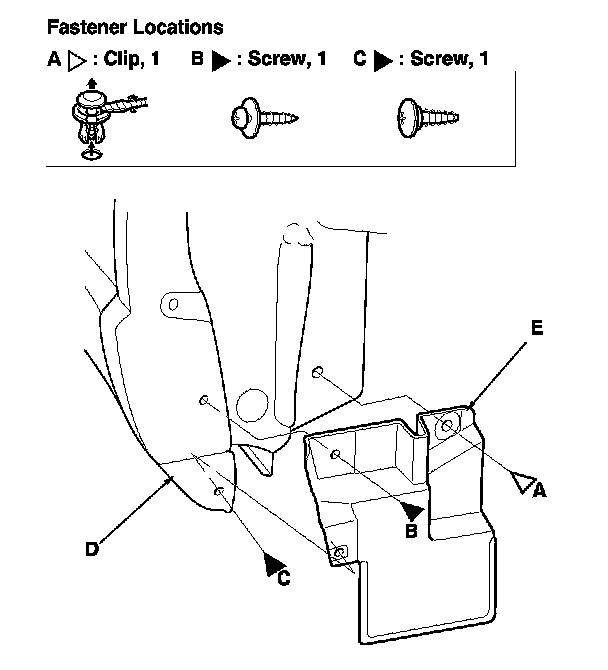 1. Remove the clip (A) and the screw (B) from the body, and remove the screw (C) from the side sill panel (D), then remove the rear strake (E) from the body.