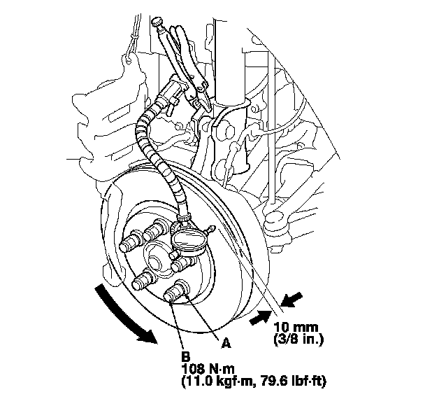 5. Install suitable flat washers (A) and the wheel nuts (B), and tighten the wheel nuts to the specified torque to hold the brake disc securely against the hub.