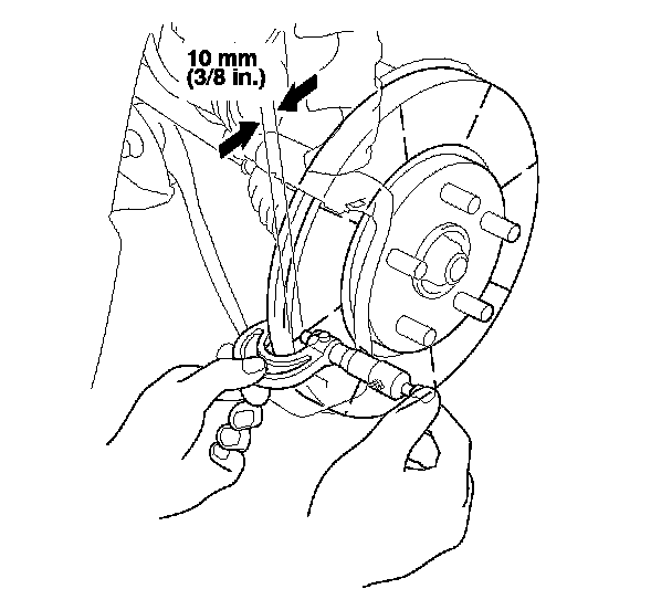 6. Set up the dial gauge against the brake disc as shown, and measure the runout at 10 mm (3/8 in.) from the outer edge of the brake disc.