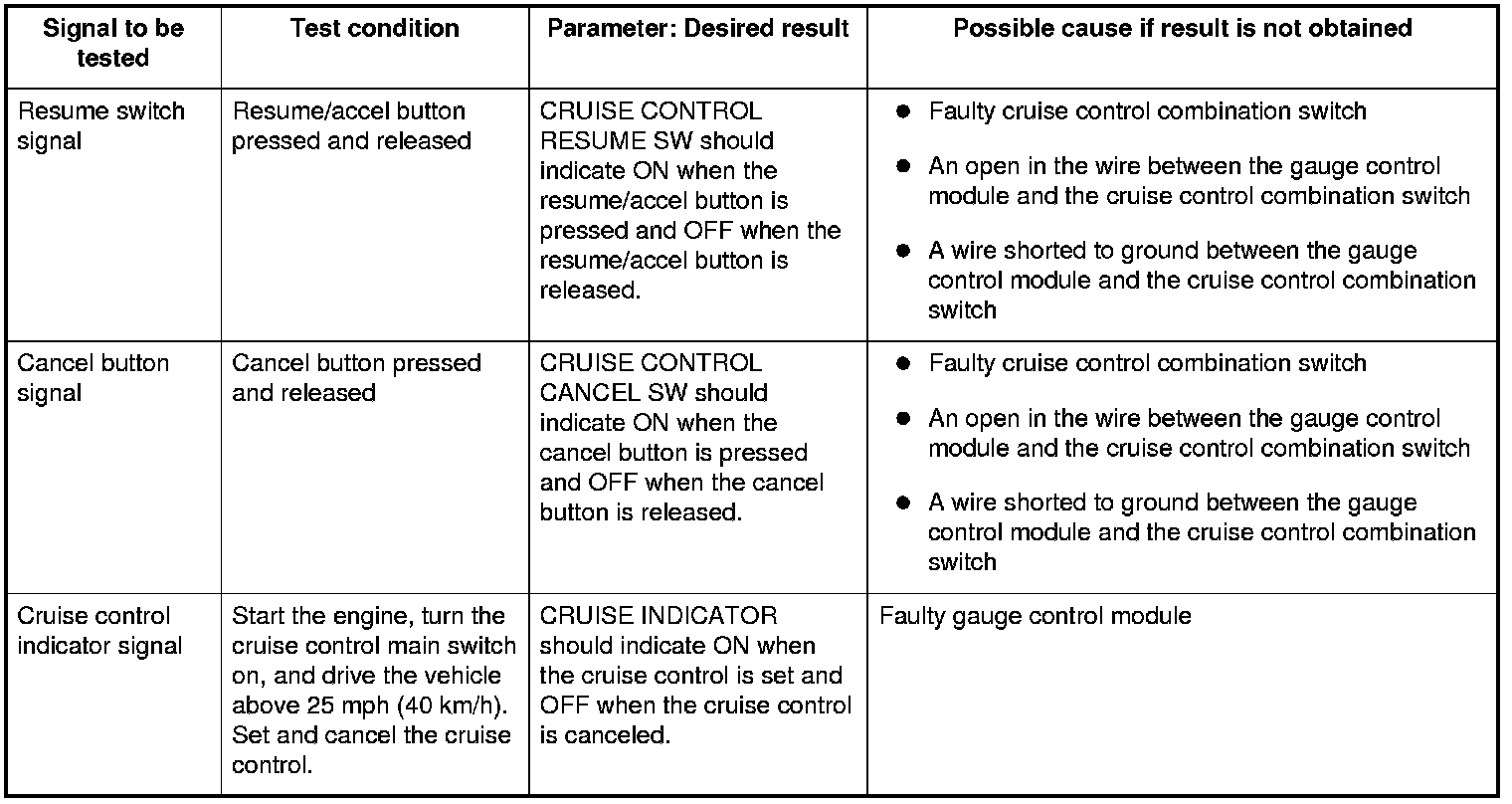 NOTE: Intermittent failures are often caused by loose circuit connections. While monitoring cruise control inputs, flex the circuits, and note if any of the test results change.