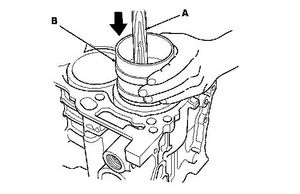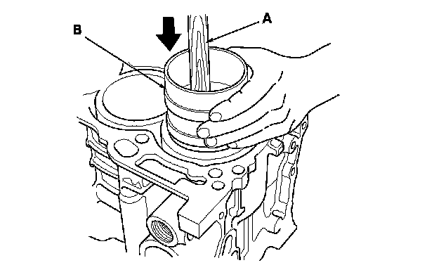 Push down on the ring compressor (B) to prevent the rings from expanding before entering the cylinder bore.