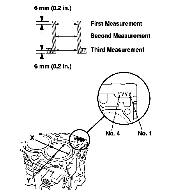 4. Measure the wear and taper in direction X and Y at three levels inside each cylinder as shown. If the measurements in any cylinder are beyond the Oversize Bore Service Limit, replace the block. If the block is being rebored, refer to step 7 after reboring.