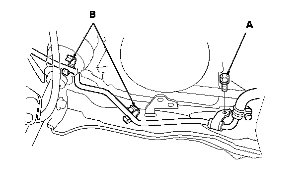30. Remove the bolt (A) securing the P/S fluid line bracket, and unclamp the P/S fluid line clamps (B) on the front subframe.