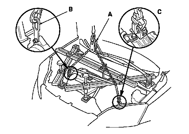 54. Attach a chain hoist (A) to the universal lifting eyelet (B), and the transmission hook (C). Lift up on the engine/transmission assembly until it's securely supported by the chain hoist, then remove the engine support hanger.