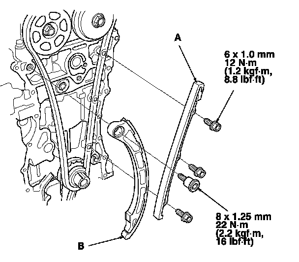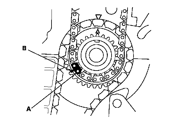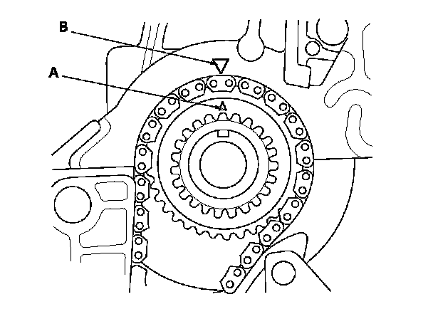 1. Set the crankshaft to top dead center (TDC). Align the TDC mark (A) on the crankshaft sprocket with the pointer (B) on the engine block.