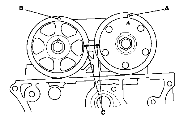 2. Set the camshafts to TDC. The punch mark (A) on the VTC actuator and the punch mark (B) on the exhaust camshaft sprocket should be at the top. Align the TDC marks (C) on the VTC actuator and exhaust camshaft sprocket.