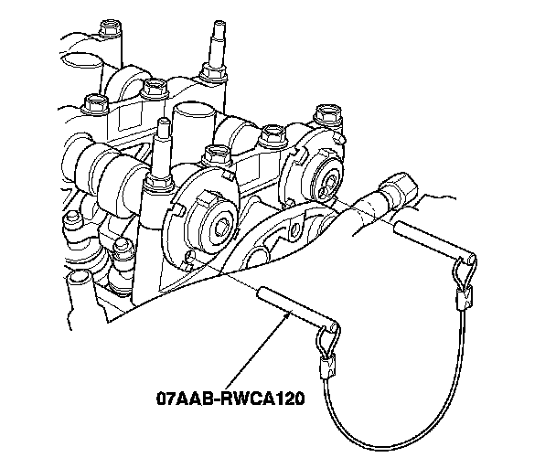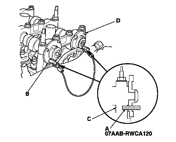 3. To hold the intake camshaft, insert the a camshaft lock pin (07AAB-RWCA120) (A) into the maintenance hole in the camshaft position (CMP) pulse plate A (B) and through the No. 5 rocker shaft holder (C).