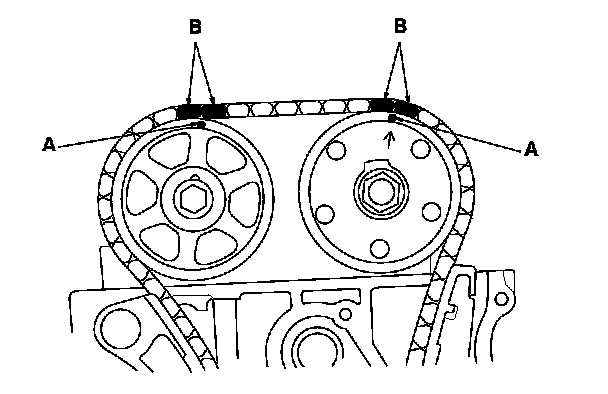 6. Install the cam chain on the VTC actuator and the exhaust camshaft sprocket with the punch marks (A) aligned with the center of the two colored link plates (B).