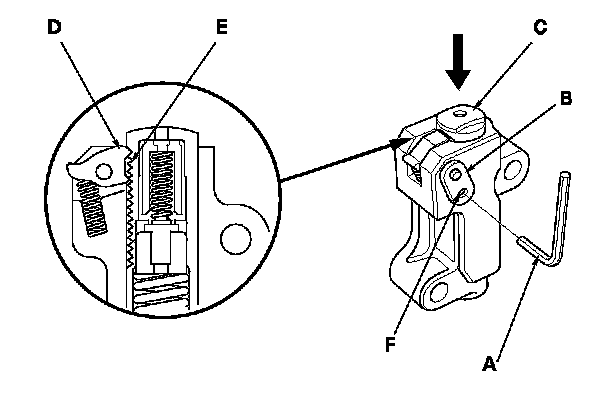 8. Compress the auto-tensioner when replacing the cam chain. Remove the pin (P/N 14511-PNA-003) (A) from the auto-tensioner that was installed during removal. Turn the plate (B) counterclockwise, to release the lock, then press the rod (C), and set the first cam (D) to the edge of the rack (E). Insert the 1.2 mm (0.05 in.) diameter pin or lock pin into the holes (F).
