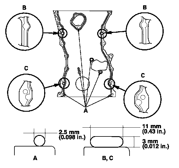 NOTE: Apply about 11 mm (0.43 in.) diameter and about 3 mm (0.12 in.) thickness of liquid gasket to the areas (B) and (C).