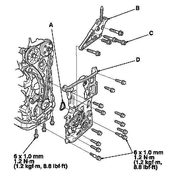 19. Install the new O-ring (A), the side engine mount bracket (B), and the mounting bolts (C) on the chain case. Set the edge of the chain case (D) to the edge of the oil pan (E), then install the chain case on the engine block (F). Wipe off the excess liquid gasket on the oil pan and chain case mating area.