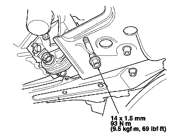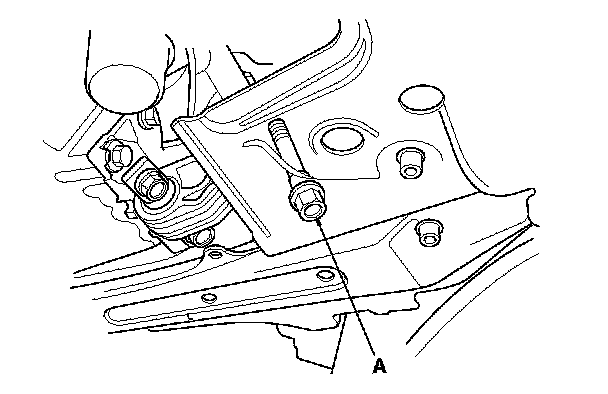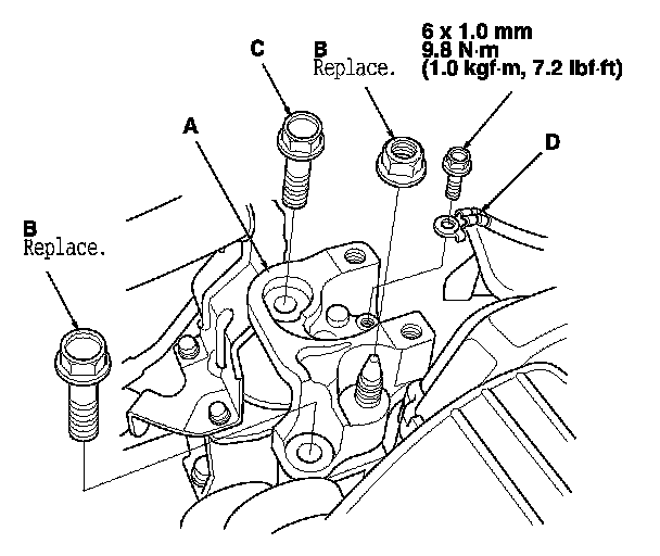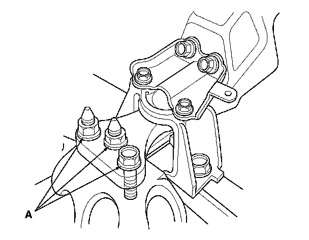 21. Install the side engine mount bracket (A), then loosely tighten the new bolt and nut (B), and loosely tighten the bolt (C).