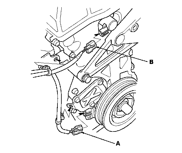 37. Connect the crankshaft position (CKP) sensor connector (A) and VTC oil control solenoid valve connector (B).