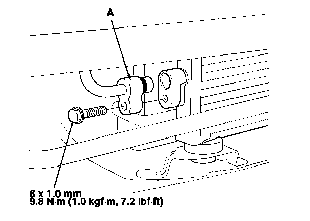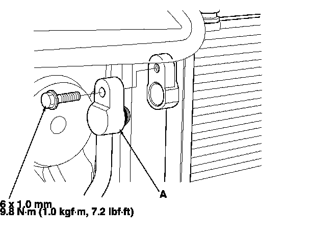 4. Remove the bolt, then disconnect the receiver line (A) from the A/C condenser.