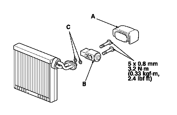 2. Remove the expansion valve cover (A), the bolts, the expansion valve (B), and the O-rings (C) without bending lines.