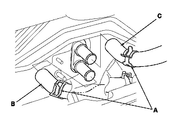 4. From under the hood, slide the hose clamps (A) back. Disconnect the inlet heater hose (B) and the outlet heater hose (C) from the heater unit. Note the orientation of the hose.