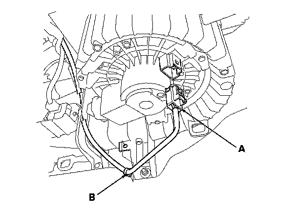 7. Disconnect the connector (A) from the blower motor. Remove the wire harness clip (B).