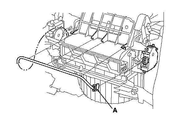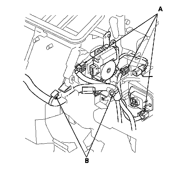 9. Disconnect the connectors (A) from the mode control motor, the evaporator temperature sensor, and the power transistor. Remove the wire harness clips (B).